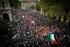 «  FLN vaincra » criait-on dans les rues de Paris, Londres ou Berlin. « Free, Free Palestine » est le mot d’ordre d’une génération qui bat le pavé des villes du monde entier. Il est des moments où la prise de conscience dépasse les milieux traditionnellement engagés. Quand la nécessité vitale de s’opposer à une politique de mort qui avilit ceux qui la mettent en œuvre emporte les cadres habituels de la protestation. Il s’agit de dénoncer le génocide perpétré par Israël et d’affirmer les droits fondamentaux du peuple palestinien bafoués depuis 1948 avec la complicité de l’Occident. Avec courage et obstination, depuis des décennies de nombreuses organisations manifestent leur solidarité avec la Palestine. Mais longtemps ce fut dans des cercles limités avec des échos assourdis. Aujourd’hui quelque chose a changé et pas seulement à cause de la monstruosité de la situation. Les gouvernements occidentaux (à quelques exceptions près) qui se voilent la face, la complicité active de l’Union Européenne avec Tel-Aviv sont devenus insupportables à une très grande partie de nos populations. Le mouvement qui s’exprime plonge ses racines au plus profond dans la société. La jeunesse que l’on dit prisonnière de son individualisme digital est dans la rue. A travers la solidarité avec le peuple palestinien, c’est aussi une politisation qui se dessine. Les manifestations rassemblent toutes les couches de la population. Femmes et hommes de toutes générations, de conditions diverses, d’origines multiples déferlent en un mouvement solidaire qui redonne confiance en l’humanité. L’exemple de l’Italie est sans doute l’un des plus frappants. Depuis une semaine la rue est devenue le domicile permanent de centaines de milliers de manifestants. Le vendredi 3 octobre, les organisations syndicales lancent un mot d’ordre de grève générale qui rassemble plus de cent cortèges dans les villes italiennes. Le lendemain à Rome le fleuve est devenu un raz de marée : deux millions dans les rues de la capitale. Du jamais vu depuis 20 ans. Les jeunes en particulier se sont pleinement reconnus dans la flottille pour Gaza. Lycéens, étudiants, jeunes travailleurs ne veulent pas s’en tenir là. Cette fois les mots de Giorgia Meloni qui ironisait sur ceux qui, à travers la grève de vendredi, voulaient un week-end de trois jours ne passent plus. Elle avait qualifié la flottille d’initiative « dangereuse et irresponsable », mais sous la pression des manifestations avait aussi été obligée d’envoyer des navires de la marine militaire italienne protéger la flottille dans les eaux internationales.[1]Le cessez-le-feu et la libération des otages sont un immense soulagement. Avant de les imposer, Trump a participé au génocide. Son plan qui nie les droits des Palestiniens et qui s’inscrit dans la logique coloniale ne peut apporter une solution durable. Tout l’enjeu sera de maintenir la mobilisation au niveau actuel.